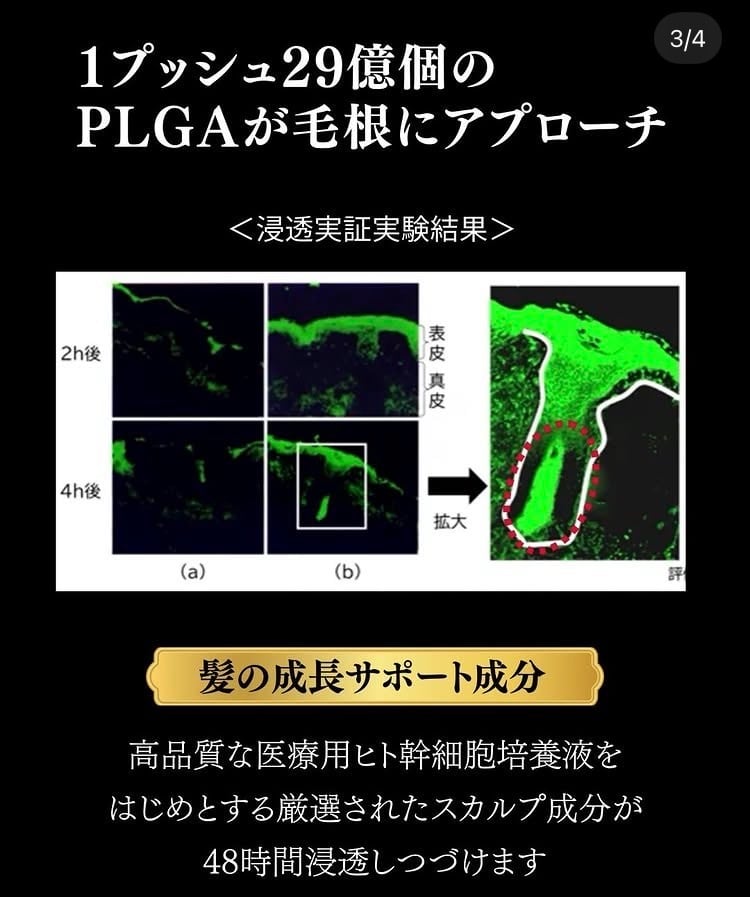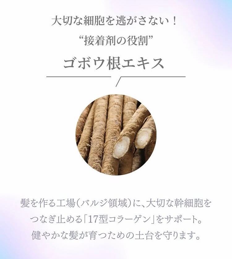 白髪、抜け毛、薄毛、髪のハリコシなどのお悩みに。ヒト幹やゴボウ根エキス他、植物のエキスなどが48時間かけて浸透。